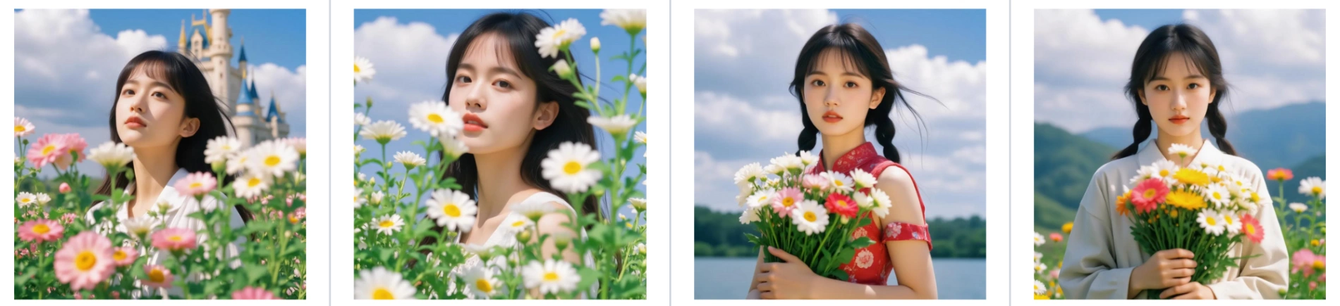 Inputting images with soft floral motifs results in a LoRA that embeds flowers and gentle organic shapes into the background and foreground of the generated subjects.
